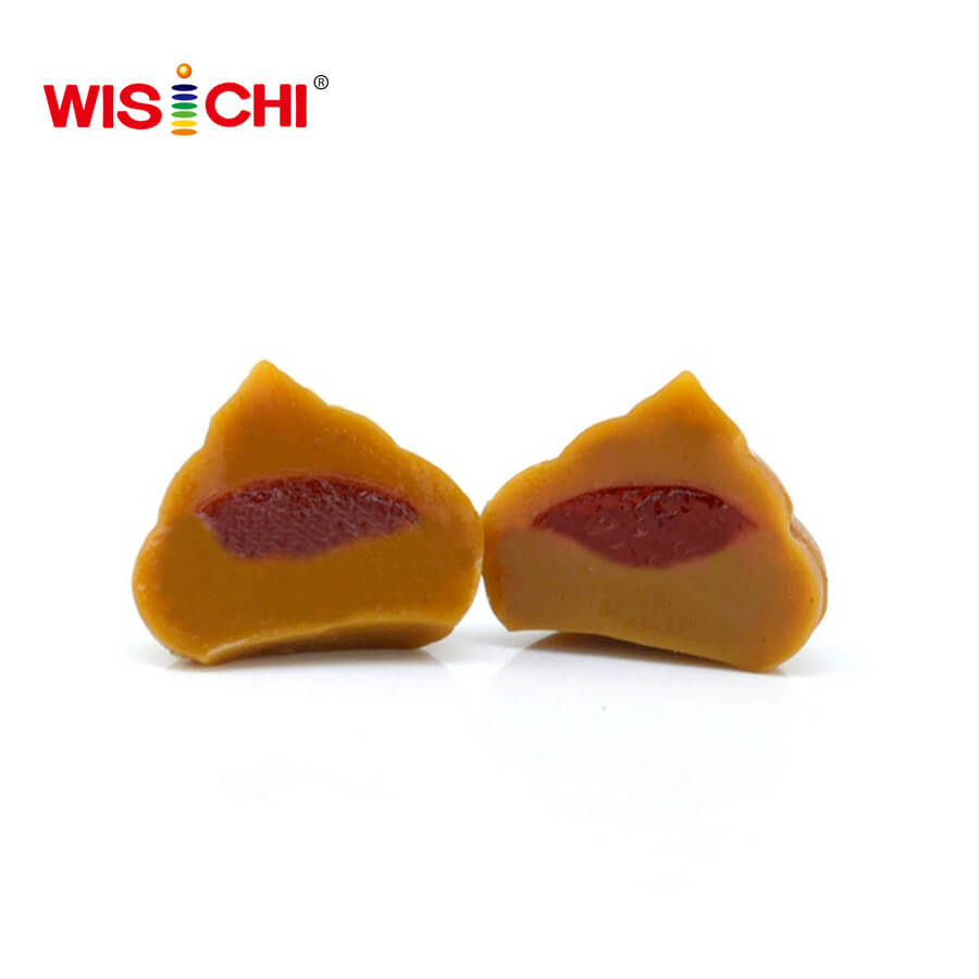 What a cute shape soft candy! It's a spoof poopoo shape but very delicious sour sweet fruity gummy candy. 30% fruit juice added in each one. And also each one and 30% jam filled. Red color with mango flavor and brown color with strawberry flavor. It's chewy and surprising when you taste it! We also support you make the color and flavour that you like! You’ll know you're in for something special from the moment you open the color bag! I believe high grade aluminum foil poopoo packing, creative poopoo candy shape, nice flavors all attract you.